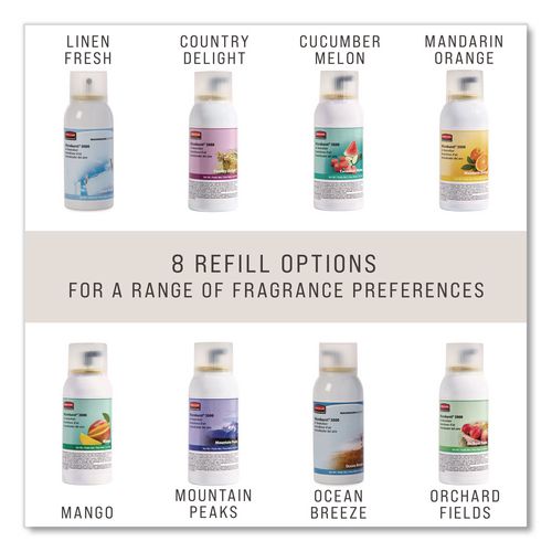 Specialized odor neutralizers break down and eliminate offensive odors, while quickly evaporating, alcohol-based fragrances keep your area pleasantly scented. Patented release actuator distributes a fine, dry mist, ensuring maximum dispersal. Long-lasting refill is good for up to 3,000 metered releases when used with Microburst 3000 dispensers.